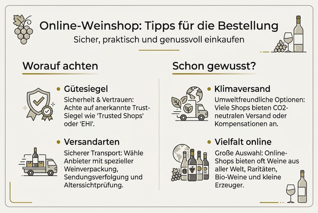 Profi-Tipp: Achten Sie beim Shopbesuch auf Auszeichnungen und Gütesiegel wie das Trusted-Shops-Zertifikat oder den Deutschen Weinpreis. Diese Siegel zeigen, dass ein Shop unabhängig geprüft wurde und Qualität liefert.