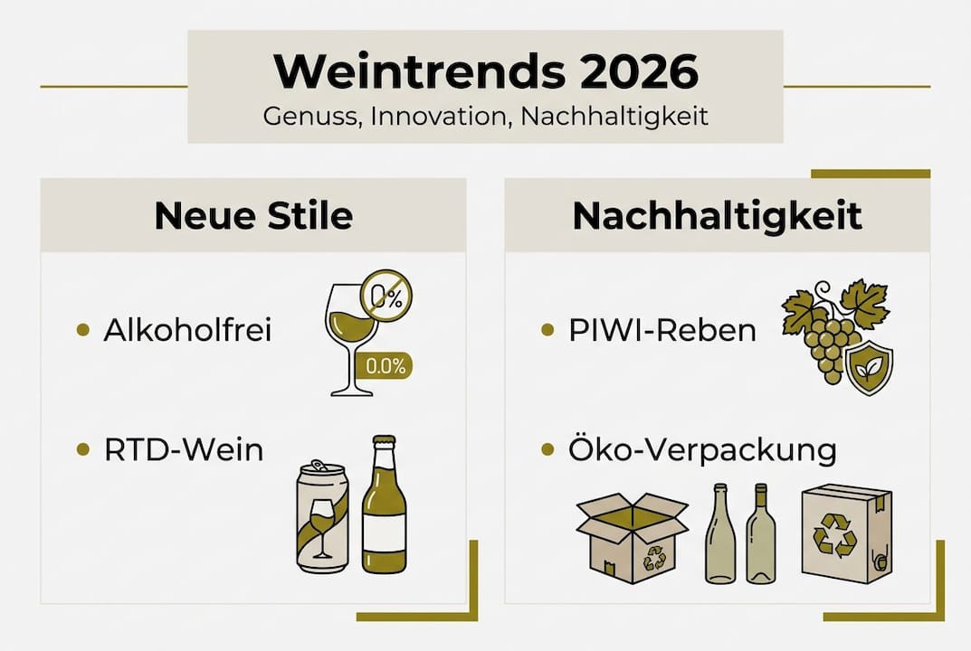 | Alkoholreduzierte Trends | 2026 wachsen alkoholfreie und alkoholarme Weine besonders schnell und prägen den Markt. |